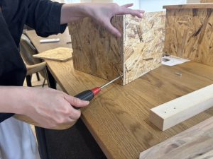「収納できるいす」の簡単な説明書を作ってみたのですが、これでいすが完成させることはできるのか確認の意味も込めて、完成形のいすしか知らない設計担当の社員さんに実際に組み立ててもらいました!(^^)!