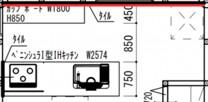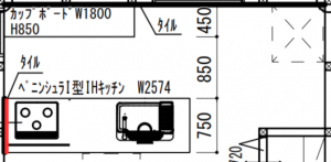 キッチンスペースの壁に張ってもらう予定で、張る部分は下の画像の赤線部分です。