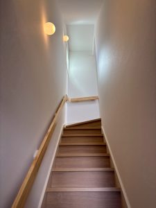 ぽてっとした、可愛らしいブラケット照明と木製のシンプルな手摺。