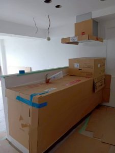 以前のブログで紹介した進捗と比べてみると、天井から垂れ下がっていたグレーの筒が綺麗にレンジフードに収まっていますね✨