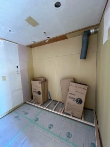 ちなみに、グレーの筒は換気用のダクトで、床に見える青やピンクの管は給水用の配管です(^^)/