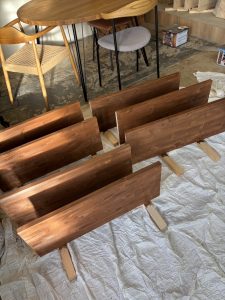 下の写真は、社員の方たちが材料に塗装を行い乾かしているところです!