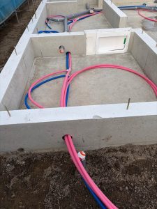 現在は基礎工事が完了し型枠が外された状態で、配管工事がが進められています。
