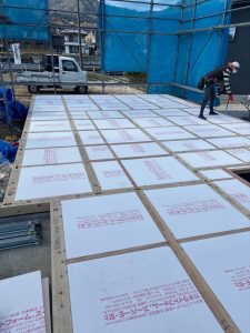 床下からの冷気や湿気を防ぐため、木材の間の空間を埋めるように床部分へ断熱材を敷きます。